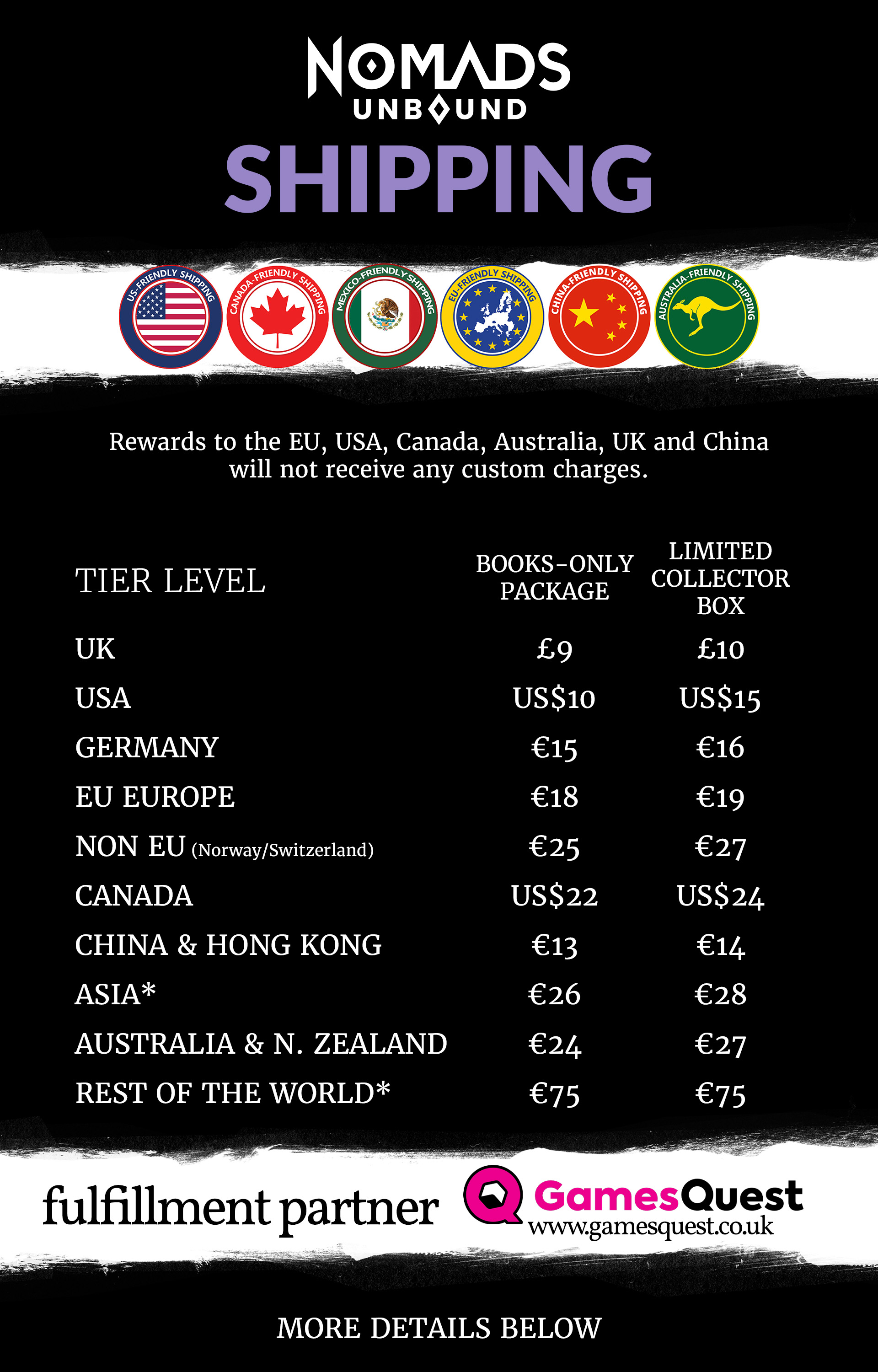 We are partnering up with GamesQuest UK, a reputable fulfillment company that has assisted numerous crowdfunding campaigns and major tabletop companies with shipping and delivering products. With their expertise and vast network of shipping hubs and carriers, we can significantly reduce shipping rates, with many locations receiving dramatic discounts of around 75%. Additionally, they will ensure that deliveries are customs-friendly for many territories, making the entire process smoother and less stressful.