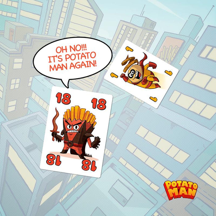 Potato Man is a trick-taking game for 2 to 5 players who compete for points over multiple rounds. Each trick is unique, and you can’t repeat suits of cards. Use your cards wisely to win the most valuable tricks and leverage the power of the mighty hero Potato Man to defeat the evil Lord Fry.