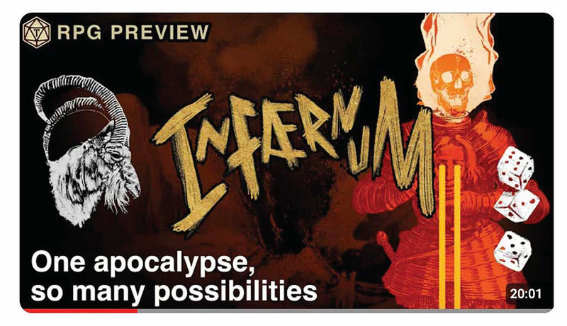 Or not. In this highly original game, you define your own vision of the Apocalypse. It can work with any campaign or setting for any system besides the standalone premise presented by the game. That means you can simply use Infaernum on top of your current RPG campaign, whatever system that might be, to explore an end-of-world scenario. It's essentially your doomsday device and toolbox.