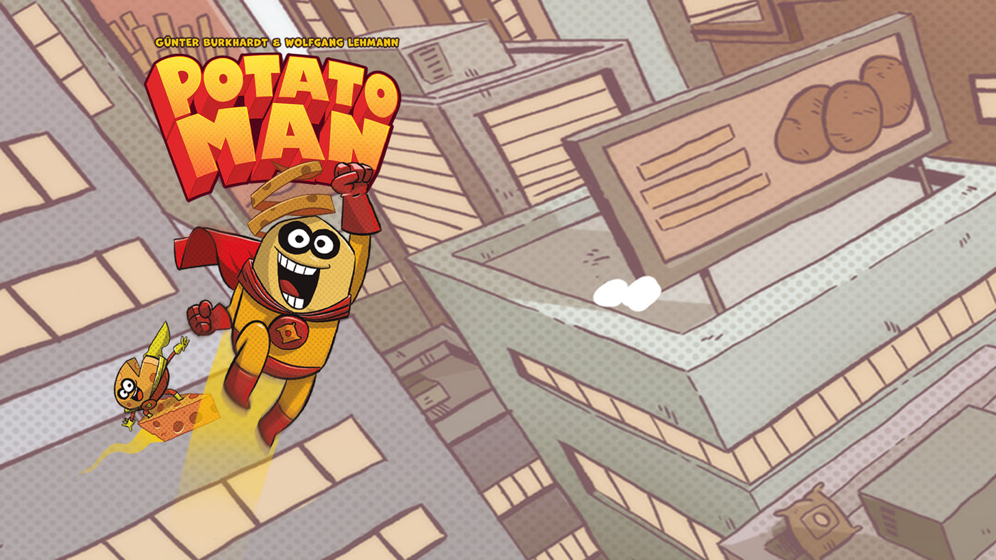 Potato Man is a trick-taking game for 2 to 5 players who compete for points over multiple rounds. Each trick is unique, and you can’t repeat suits of cards. Use your cards wisely to win the most valuable tricks and leverage the power of the mighty hero Potato Man to defeat the evil Lord Fry.